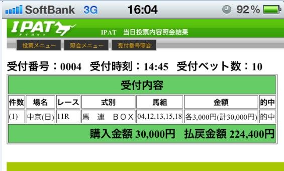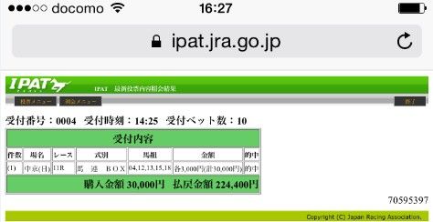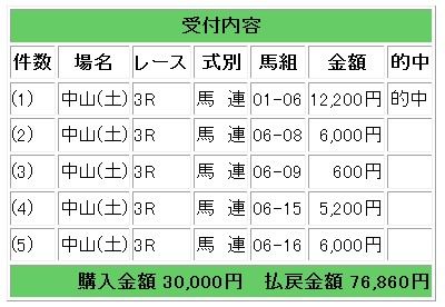 馬連指示にて7480円的中となり、22万4400円の払い戻しとなりました。