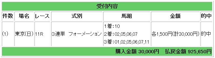 結果はルージュバックが1着となり、3連単617.1倍的中となりました。