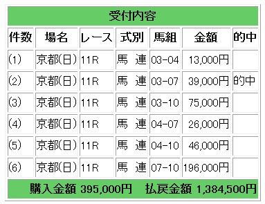 会員様には紫苑S組を中心とした馬券指示で馬連3550円的中となり138万4500円の払い戻しとなりました。