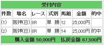 結果は1ラッキーライラックと9リリーノーブルからの3連複3点指示的中で31万5400円の払い戻しとなりました。