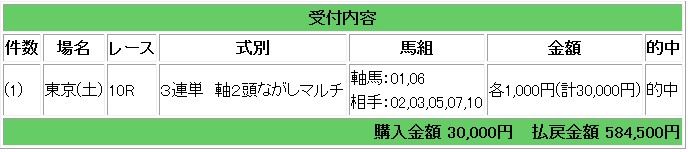 3連単指示で馬券購入となり、9187倍的中で91万8700円の払い戻しとなりました。