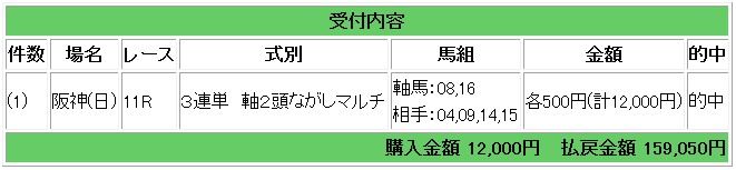 結果は上記2頭のワンツー決着となり、3連単318.1倍的中で15万9050円の払い戻しとなりました。