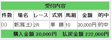 会員様には10ライブスキアの単勝 1点指示となり、7.4倍的中で22万2000円の払い戻しとなりました。