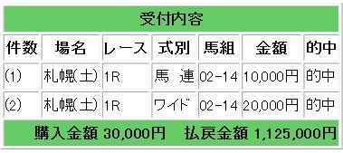 会員様には上記2頭の馬連・ワイド各1点指示での情報提供となり、上記情報馬2頭のワンツー決着で馬連71.5倍、ワイド20.5倍ダブル的中で112万5000円の払い戻しとなりました。