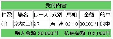 会員様情報では上記2頭の馬連1点指示となりましたが、上記2頭のワンツー決着で5.5倍的中となり、165000円の払い戻しとなりました。
