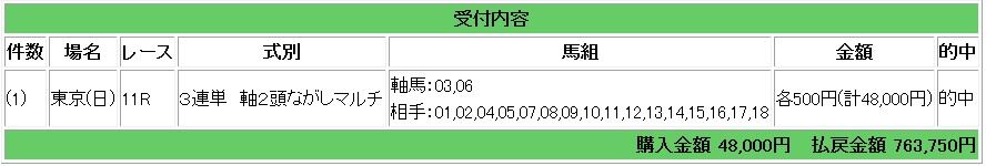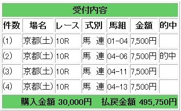 結果は9番人気の4ミッキーブリランテが1着となり、馬連4点指示で66.1倍的中で49万5750円の払い戻しとなりました。