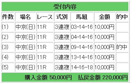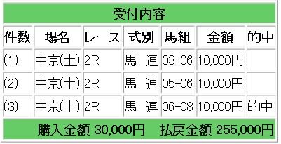 会員様情報では危険な人気馬7ぺダンクルアーチ(1番人気7着)を切った馬連3点指示で25.5倍的中となり、25万5000円の払い戻しとなりました。