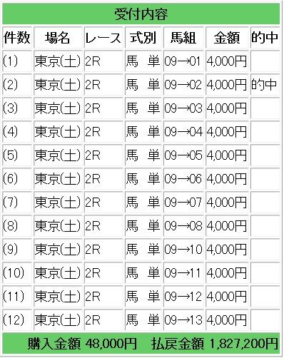 会員様には9サミアド1着固定の馬単指示で456.8倍的中となり、182万7200円の払い戻しとなりました。