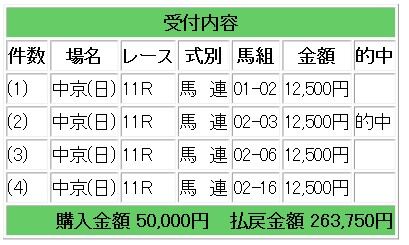 会員様にはマッドクールからの馬連4点指示で21.1倍的中となり、26万3750円の払い戻しとなりました。