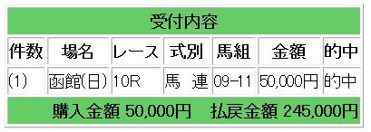 上記情報馬のワンツー決着となり、馬連4.9倍的中で24万5000円の払い戻しとなりました。