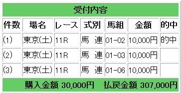 3番人気のトリコロールブルーが2着となり、馬連30.7倍的中となりました。