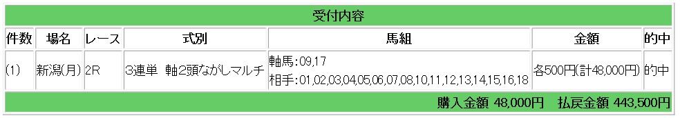 上記情報馬が2,3着となり、3連単887倍的中で44万3500円の払い戻しとなりました。