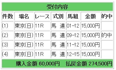5番人気のサンライズジパングからの馬連4点指示で18.3倍的中となり、27万4500円の払い戻しとなりました。