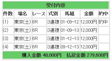 上記4頭の3連複指示となり、23.3倍的中で27万9600円の払い戻しとなりました。