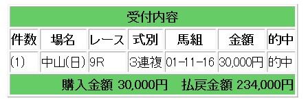 上記3頭の3連複指示で7.8倍的中となり、23万4000円の払い戻しとなりました。